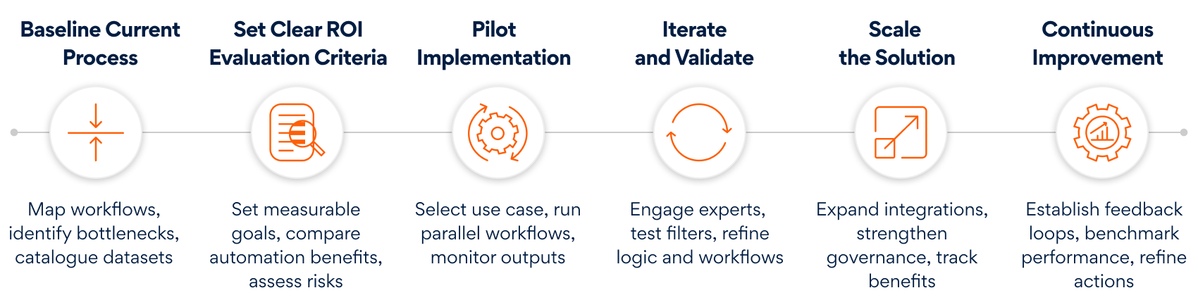 To bring (AI)InSite function in motion, large pharma companies designed a step-wise approach that acts as an execution blueprint—progressing from understanding current processes to defining ROI, piloting, iterating, scaling, and continuously refining the system. Here’s a quick glance: